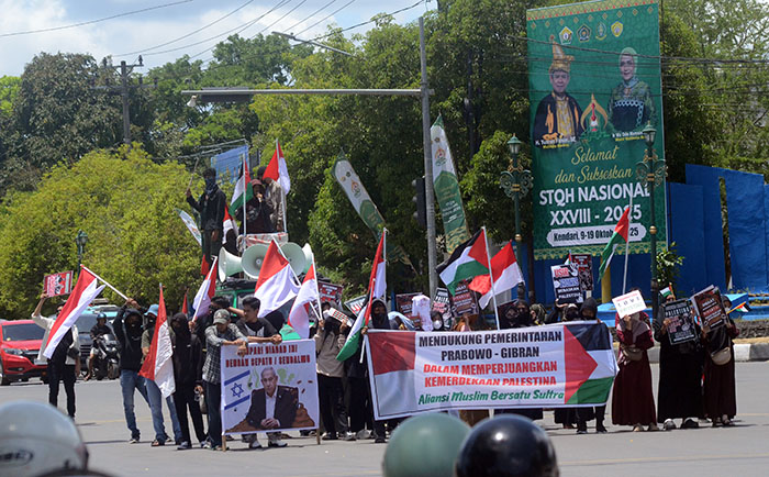 Koordinator aksi, Alamsyah dalam orasinnya mengatakanpihaknya sangat mendukung pemerintahan Prabowo-Gibran untuk memperjuangkan kemerdekaan negara Palestina.
