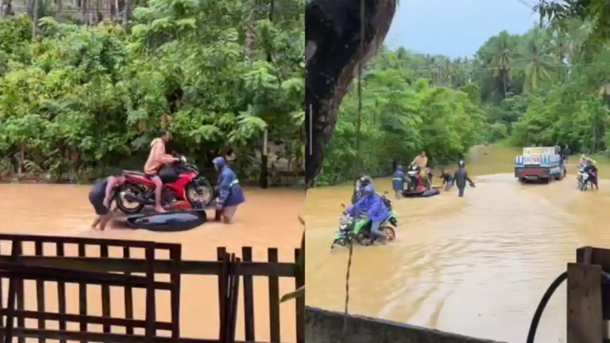 Kendaraan roda dua beserta pengendaranya pun mengapung di atas banjir, sementara tiga orang lainnya mendorong dan menstabilkan ban pelampung.