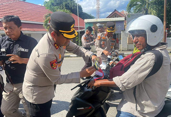 KENDARI, Pelitasultra.com – Polda Sulawesi Tenggara (Sultra) dan Polres jajaran bagikan ribuan bendera merah putih ke masyarakat khususnya pengguna jalan pada Selasa (5/8/2025).