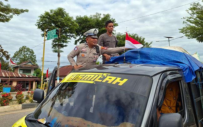 Selain pemberian bendera merah putih, para petugas Lalu lintas juga memberikan imbauan ke warga agar selalu tertib berlalu lintas, dan mengutamakan keselamatan saat berkendara.