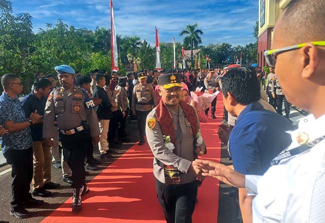 KENDARI, Pelitasultra.com –  Pejabat Utama (PJU) Polda Sulawesi Tenggara bersama seluruh personil menyambut Kapolda yang baru Irjen Pol Didik Agung Widjanarko, S.I.K., M.H dengan tradisi welcome and farewell parade, Selasa (27/5/2025).