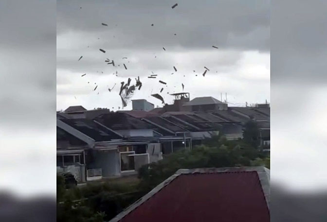 Sejumlah atap rumah terlihat terangkat lalu melayang hingga puluhan meter akibat kencangnya hembusan angin.
