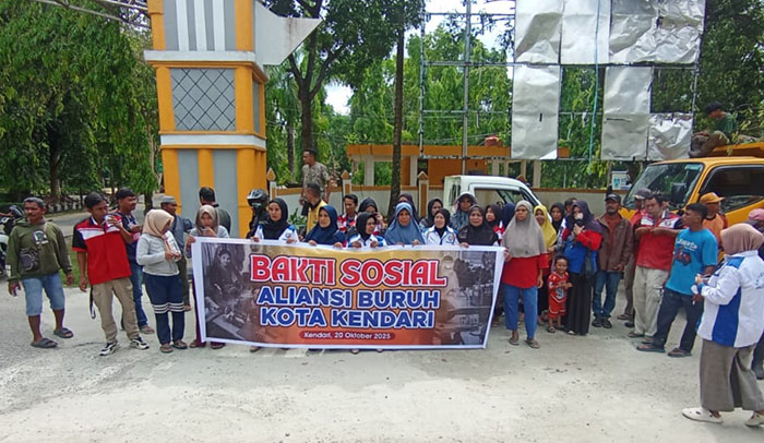 KENDARI, Pelitasultra.com – Aliansi Buruh Kota Kendari menggelar bhakti sosial pembagian bantuan sembako yang berlokasi di Jalan H.E.A. Mokodompit, tepatnya depan Kampus Universitas Halu Oleo (UHO) Kota Kendari, Senin (20/10/2025).